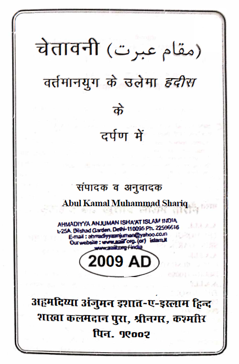 Chetavni : Vartaman yug ke Ulama Hadees ke Darpan Mein is hindi translation of the urdu book Mukam-e-Ibrat, translated by Dr. Abul Kamal Muhammad Shariq